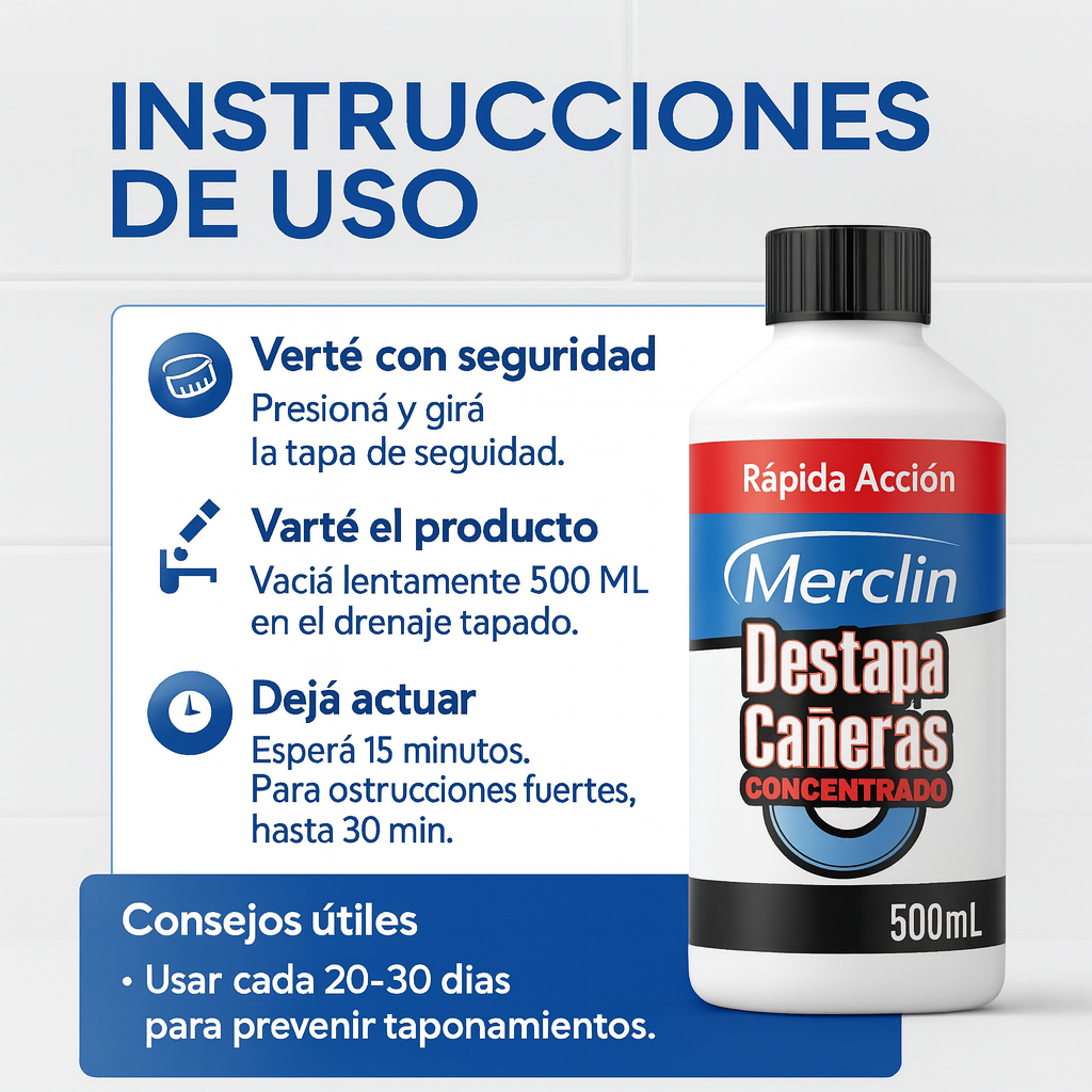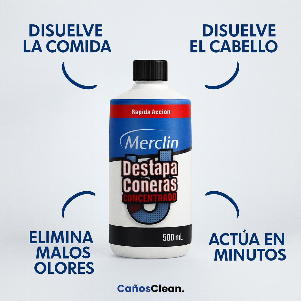 Es un destapador de cañerías de alta potencia, diseñado para disolver grasa, cabello y residuos acumulados, eliminando malos olores y evitando futuros atascos en desagües de cocina, baño y lavadero.
